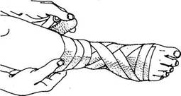 После того как вы дважды обернули бинт вокруг стопы, возьмитесь одной рукой за пятку. Второй рукой сделайте виток вокруг ноги в виде восьмерки, оставив пятку свободной. Сделайте еще одну <восьмерку>.